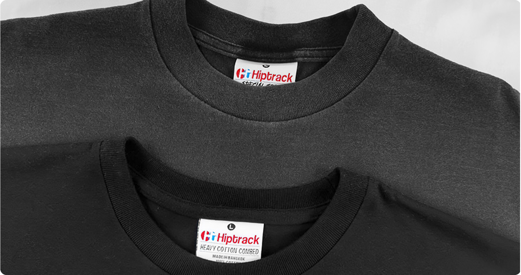 Hiptrack เป็น Cotton20 Comb ที่ตัดเย็บแบบตะเข็บเดี่ยวทรงวินเทจเป็นแบรนด์ที่วัยรุ่นชอบ และเป็นแบรนด์ดังในกลุ่มวัยรุ่น Size ฝรั่ง (รุ่น Heavy Cotton คอธรรมดา สีขาว และดำ, รุ่น Spacial สีเฟดดำ) เนื้อผ้ารุ่น Heavy Cotton Combed เกรดผ้าหนาที่สุดเหมาะสำหรับคนที่ชอบผ้าหนาเป็นพิเศษ สัมผัสนุ่ม เนื้อผ้าเนียนละเอียดอยู่ทรง ทิ้งตัว ได้ดี ผ้าตัวนี้ถือได้ว่าดีที่สุดสำหรับสายเสื้อยืด ทั้งการทอและการย้อมแบบพิเศษด้วยเกรดพรีเมี่ยมเป็นผ้าฝ้าย 100% ที่มีการหดตัวน้อยที่สุด (สามารถพิมพ์สีกัด ดิสชาร์จได้ เพราะย้อมสีแบบพิเศษ)