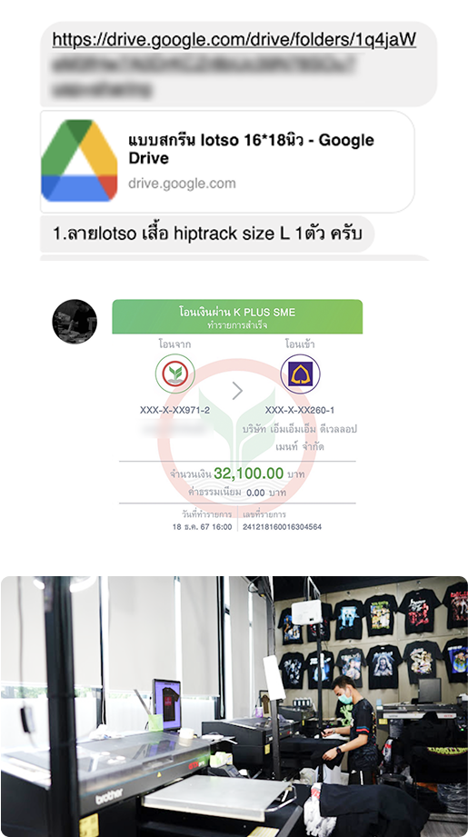 เมื่อทำการคุยละเอียดเป็นที่เรียบร้อย ลูกค้าทำการ โอนเงิน / แจ้งสลิบ แอดมินทำการลงคิวสกรีน และช่างสกรีน (ตามลำดับคิว)